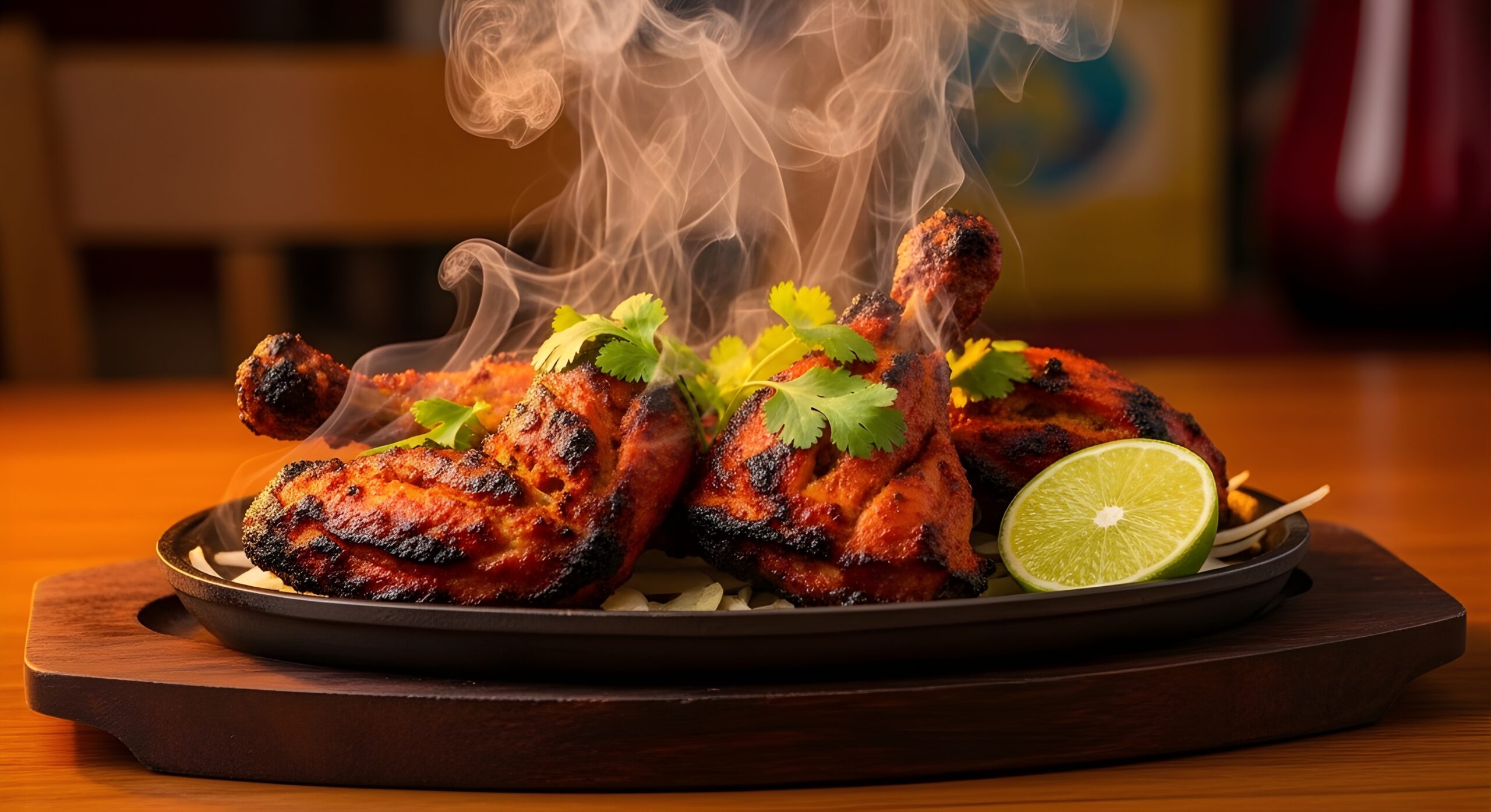 Grillad kyckling med ben, marinerad i tandoorikryddor, yoghurt och lime. Severas med krämig lök- och tomatsås.